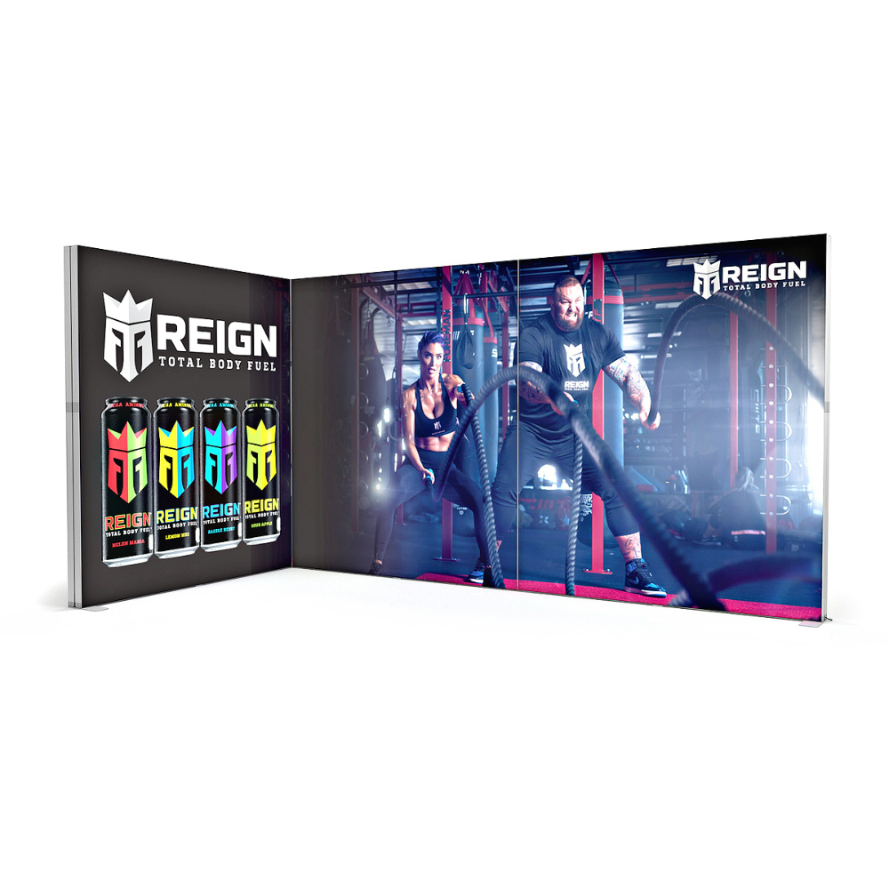 4x2 Kumaş Modüler Lightbox Backdrop Seti, küçük ölçekli etkinlikler, fuar alanları ve perakende mağaza ortamları için idealdir. Set, 90° açıyla birbirine bağlanmış 2 adet lightbox kumaş ışıklı kutudan (400x230 CM ve 200x23030 CM ) oluşur ve köşe stand formu oluşturur.